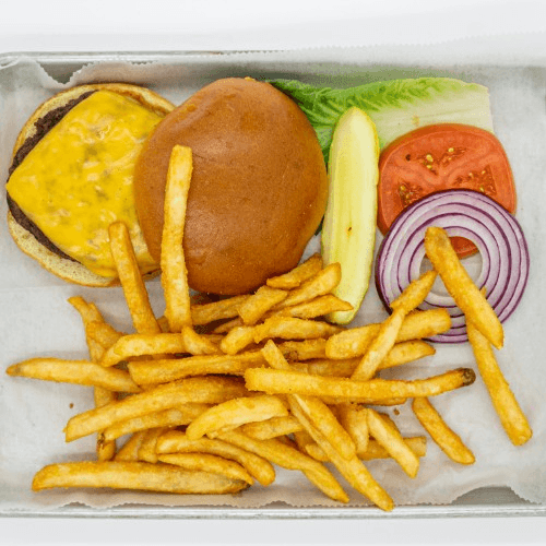 Classic Burger with your choice of cheese. Burgers are made with a custom 1/2 lb blend of short rib, brisket and angus beef. All burgers are served on a brioche bun with fries, pickle spear, lettuce, tomato, onion can be substituted with a veggie burger or chicken breast.