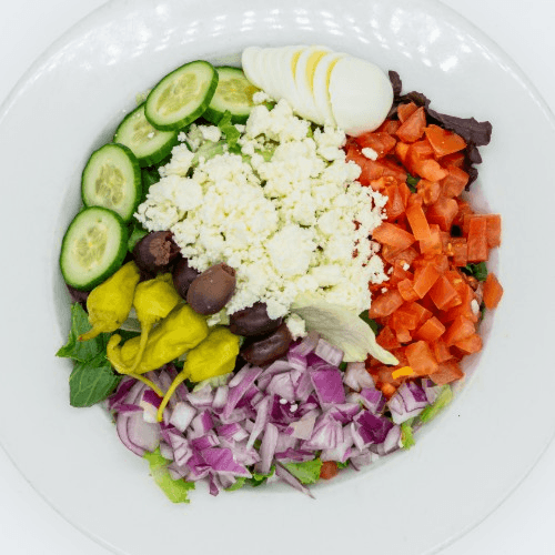 Sliced egg, cucumber, pepperoncini, kalamata olive, tomato, onion and feta cheese