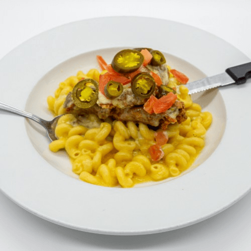 Fried Chicken, Blanco, Jalapenos, and Tomato over Mac & Cheese Base